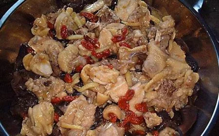 桂圆肉30克,枸杞15克,子母鸡1只,料酒10克,胡椒粉2克,生姜10克,葱10克,味精2克,食盐3克。