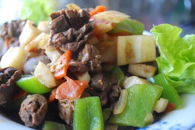 中文名称 藕爆鸡心 主要食材 藕,鸡心 口味 微辣 配料 胡萝卜、洋葱、辣椒酱 调味料 葱、蒜、生抽、盐、姜 材料: 鸡心,藕,青椒,胡萝卜,洋葱做法: 洋葱切碎 青椒,胡萝卜切块来自,鸡心焯水,去油,切花刀 葱姜蒜爆锅,加生抽,辣椒酱,炒胡萝卜,然后就加鸡心,加水,炖一会 最后,加藕,青椒,盐,淀粉勾芡 点击展开全文 转载请注明出处安可林文章网 » 藕爆鸡心