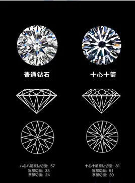 普通车工基本都是57面的标准明亮式切割钻石,其中冠部31个切面,亭部27个切面;81个切面的多面型钻石,其中冠部51个切面,亭部30个切面,比普通车工多24个切面,用专业的车工放大镜能看到完美对称的十组亮口业乎功仍心箭图案。