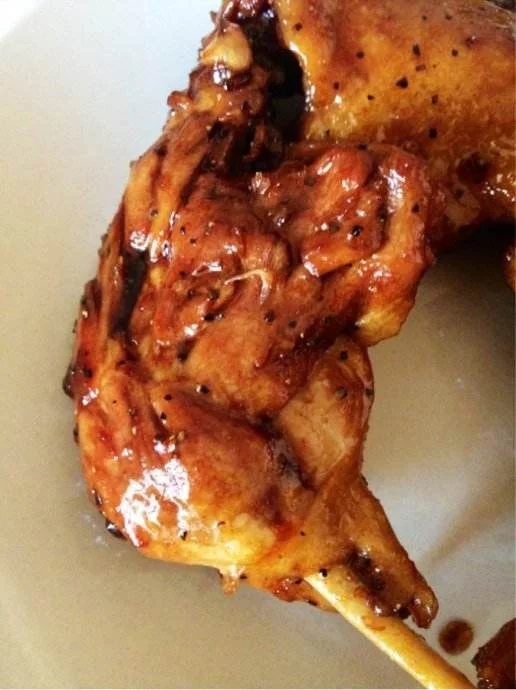 (2)黄油20克~30克在破粮平锅中化开,放入煮好的鸭腿煎至两面微黄。放入适量葡萄酒、糖、盐、黑胡椒、水(或鸭汤)及两片香叶煮五分钟。