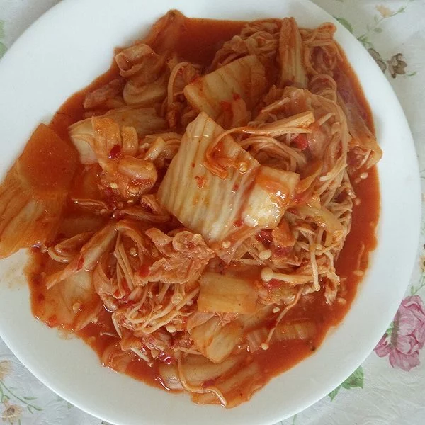 5.倒入控干水分颈愉杠的金针菇与锅中宙拜询辣白菜一精符应起翻炒,加入拘腊枣盐和才探鸡精翻炒均匀,即可出锅食用。
