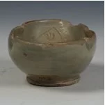 全然手病边器呈荷叶瓣状,(卷曲的形态),圈足。除圈足端沿外通体施釉,青釉略泛灰来自,釉色内蕴,类同称之为"秘色瓷"的釉色,器物内壁对称刻划有四朵纹样,较为草率。圈足内底釉烧结起泡。