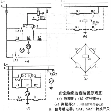 直流绝缘监来自察装置装置分为信号和测量两部分,且均按直流电桥的工作原理进行工作的。它能在任一极的绝缘电阻降低时,自动发出灯光和音响信号,并且可利用它判断出接地极和正、负极的绝缘电阻值。