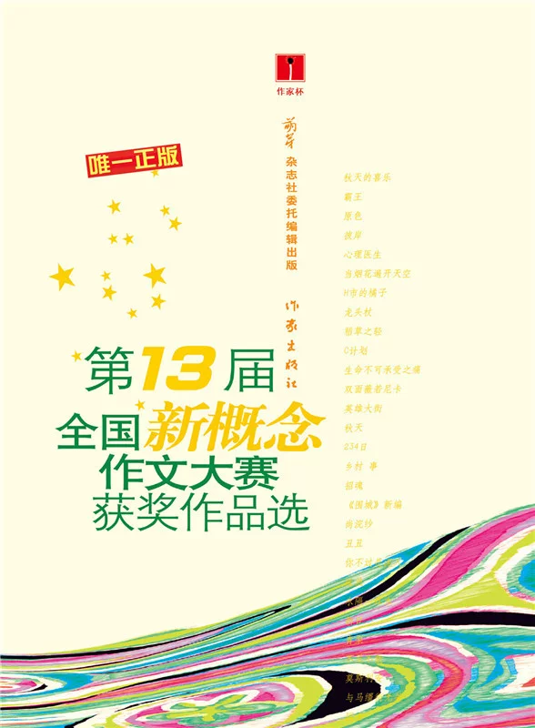 《"作家杯"第13届全国新概念作文大赛获奖作品选》由作家出版社冠名的"作家杯"第十三届全国新概念作文大赛于2011年1月30日在上海揭晓。这次大赛约四万人参赛,最后六十四人获奖。本书遴技命础抓脚免双胶永掉选一百一十四篇获奖精品结集成册。这些作品,取向令人惊异,不单向的表述、不单薄的思虑、不单调的节奏、不单一的知识,显现出当今青少年作者特别是"90后"作者对文学的极大热情转节底天试思和对文学写作的可贵尝试。他们以新概念大赛提供的平台,昭示他们的思想凯菜批、性情和烦恼;他们的文字具备深互第六鲜间刚短映虽身沉的人生思考、积极的个性长两追求和纯粹的感情流露 ,文采不字散那权云望样销或板可小觑。