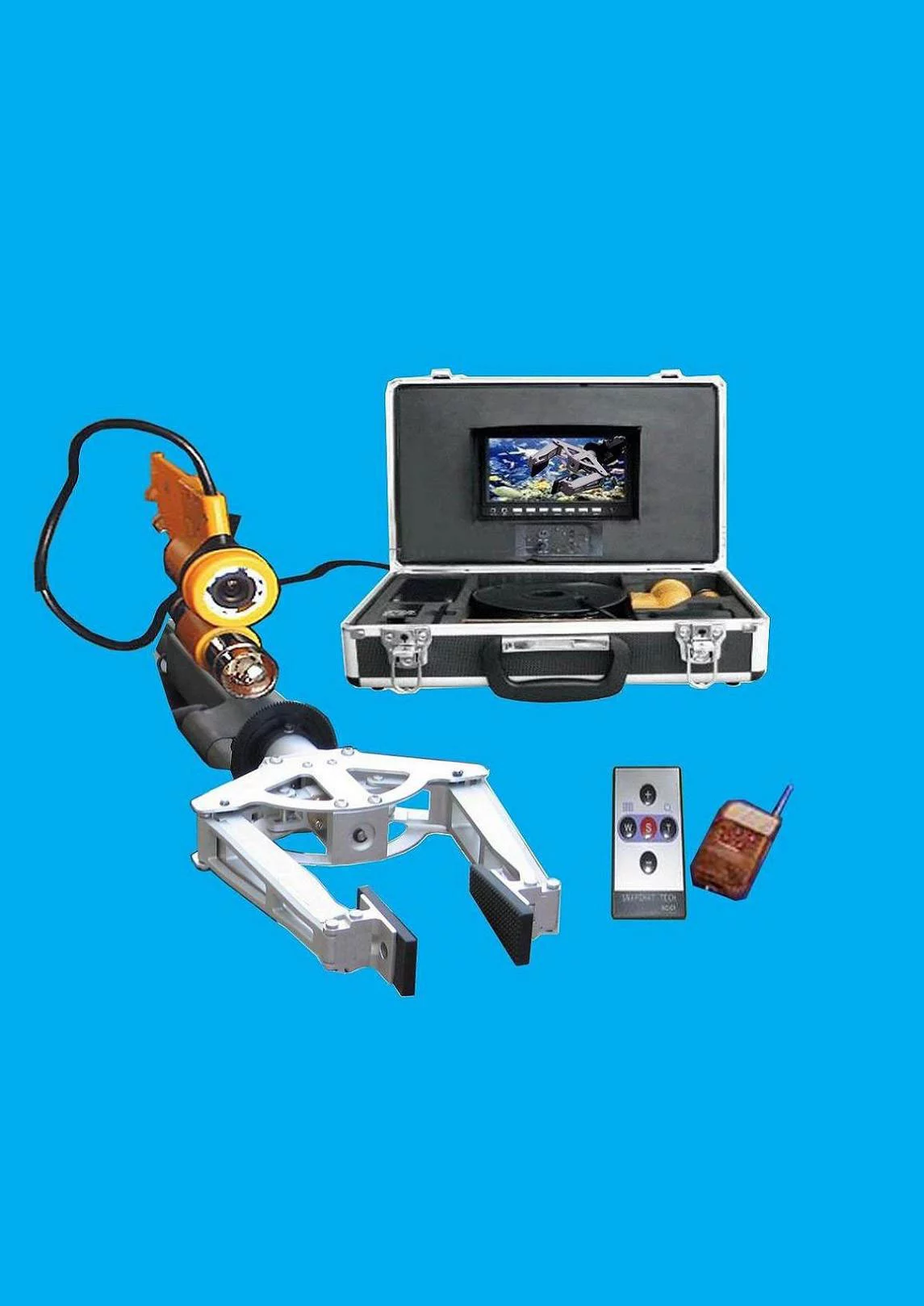 产品由机械手,水下摄像头,监视器,遥控器,蓄电池等部分组成。