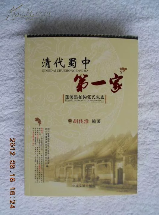 《清代蜀中第一家:蓬溪黑柏沟张氏家族》,胡传淮编著,25万字,2012年中央文献出版社出版。蜀中蓬溪黑柏沟张氏家族,是一支兴盛时间长达200余年,在中国政治上、文学上、书画史上均有重要影响的家族。张鹏翮号称名相,是清代268年间四川官位最显赫、相业最优异、名声最响亮的人物;其玄孙张问陶(号船山)是清代蜀中诗冠。明清以来,张氏家族成员,中进士者6人、举人18人、贡生18人,为官者80余人,1人入《中国通史》、2人入《辞海》、3人入《清史稿·列传》、4人入《中国文学家大辞典》,有文学家13代80余人,不断地续写出这个家族的辉煌,张船山少年被喻为"青莲再世",更因其诗、书、画造诣颇深,诗名满天下,被誉为"蜀中诗人之冠";康熙、雍正两帝还亲自为张家赠匾、赐书甚多,当时蜀中张家可谓荣光之至,享誉西南,名满天下,为清代巴蜀第一大家望族,人称"清代蜀中第一家"。因此,无论从政治上或从文化上,都有必要对清代黑柏沟张氏家族进行全面、深入的清理和研究。《清代蜀中第一家:蓬溪黑柏沟张氏家族》一书,共计25万言,著名学者、南京师范大学文学院博士生导师江庆柏先生撰序,2012年5月中央文献出版社出版。该书以黑柏沟张氏家族的源流世系、家族名人、诰敕御书、科第仕宦、著述艺文、文物古迹为重点进行考察、阐述;客观简略地叙述了张氏家族奋斗史,特别是张氏为涪江文化、巴蜀文化和华夏文化所做出的不可磨灭的贡献;对黑柏沟张氏家族进行一次全面、深入的梳理和宣传。为研究明清家族史、巴蜀文化史,宣传打造蓬溪名人名居,作了十分有益的探索。