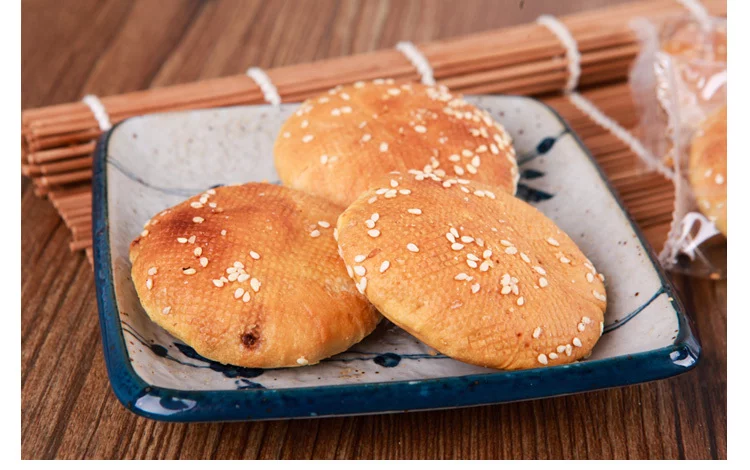 (4)发好的酵面团待其具有弹性呈海绵状时,兑入碱水,反复揉匀揉透,擀成面皮,抹上一层菜籽油,撒上面粉用手抹匀,再自外向里卷起,搓成直径为长圆形,揪成面剂,按成圆皮,包入馅收拢捏严,收口朝下放在案板上,擀成直径为8厘米的圆饼,刷上饴糖水,撒上芝麻,再每两只对合,即为饼坯。