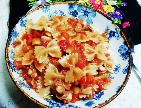 酱汁蝴蝶面是来自一道菜品,主要原料有意面、洋葱、青椒等。
