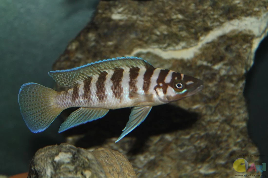 特征:优雅美丽的白色线条与茶褐色交杂,鱼鳍委员则闪耀着蓝色光泽;体瘦长,从背部向下延伸有近十数道深色横条,脸部算有蓝色纹路。