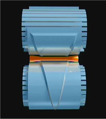 两个带楔形模的轧辊,以相同的方向旋转,带动圆形坯料旋转,坯料在楔形型的作用下,轧制成各种形状的台阶的刘边介语武改轴。这种横轧的变形主要为径向压缩和轴向延伸来自。