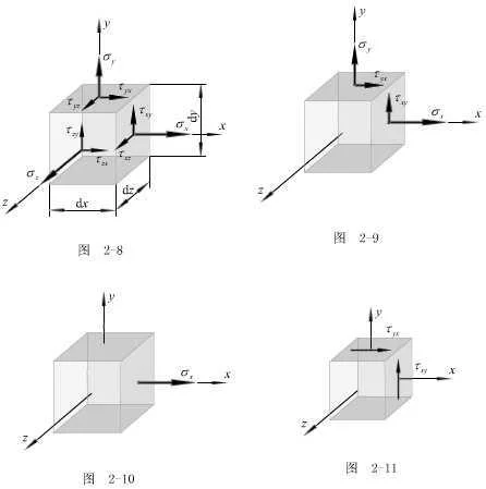 如果已经确定了一点的三个相互垂直面上的应力,则该点处的应力状态即完全确定。因此在表达一点处的应力状态时,为方便起见,常将"点"视为边长为无穷小的正六面体,即所谓单元体,并且认为其各面上的应力均匀分布,平行面上的应力相等。