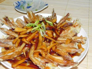 作法:将黄花菜用温水发好每根撕成五瓣,3-4根捆成小捆,制成黄花菊胚。鸡蛋打散,黄花菊胚与鸡蛋液撒干淀粉后入油锅炸成外脆色金黄,调糖醋味汁,淋入黄花菜上即成。