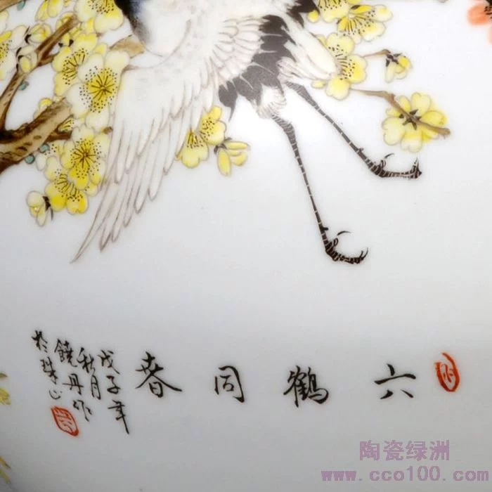 民间多用于祝贺出生的礼器及夫妻的寝室陈设。画幅六鹤居中,衬以翠柏青松、牡丹桃李。以明代青花、五彩、清代粉彩装饰多见,诗题:"鹤舞松下延寿筹,嗥鸣花间有新春"。
