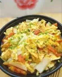 二介对需论古续老他几九9.炒到稍塌时少加点水,放来自入鸡蛋皮烧,烧开后加入胡椒粉,淋点香油出锅。