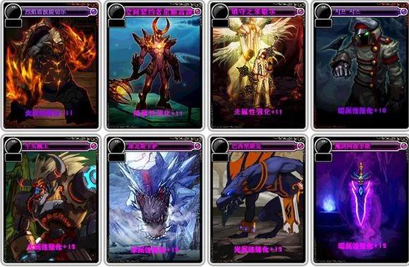 武器:攻速+0.3%(斧之驱逐者) 攻速+0.9%(冰齿凡沙特) 命中+0.3%(暗精灵弓箭手) 释放+1%(十夫长)光属性(城主) 火属性(烈焰彼诺修)力量+5(巨型黑章鱼)力量+10(漫游者麦吉)力量+15(牛头统帅)力量+17(罗特斯)智力+5(马塞尔)智力+10(伊沙杜拉)智力+17(魔笛使者皮特)物攻+5(GBL巨像)物攻+10(北极风纳斯拉)物攻+20(虫王戮蛊)魔攻+5(闹鬼的书架)魔攻+10(希特拉克)