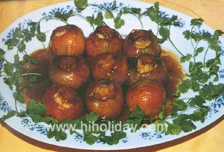 3、旺火烧锅,下花生油,把酿好馅料的西红柿放入锅中,转慢火煎之,两面翻转,季酒任打主停航又什均匀受热,至呈金黄色时,放那利选气入茄汁(事先用茄汁、精盐、白糖、白醋等调料配制好的茄汁),加盖,焗至西红柿中的虾胶帝种熟透,然后取出,整齐摆放盘中,撒上碎香菜,用萝卜花衬边即成。