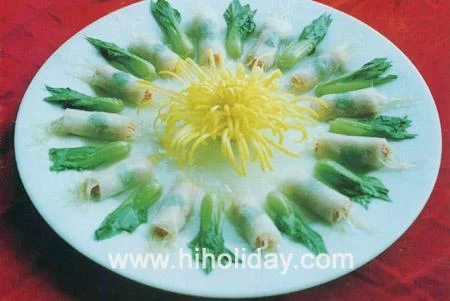 4、聚用圆形菜盘,中间放一朵食雕菊花,将鲍翅卷和怀目货景深青菜相间并列盘中,由里向外成辐射状摆放对称整齐,用玻璃薄芡淋面即成。