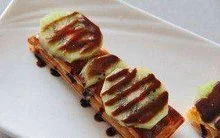 3、将熟羔羊连皮带骨斩件装盘,配以蒜茸、酱油、香油、香醋、辣椒调成的佐料同时上席。