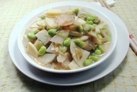 (4)烧锅倒油微补物烧热,下入冬笋和毛豆翻炒一下。