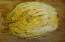 选菜棵饱满,包心结实,菜叶白嫩的大白菜。将大白菜根切掉,剥去黄,老菜帮,用刀切成半。用清水洗净后,放入沸水中进行热烫。热烫时,应先将菜的茎部放入沸水里于左,然后再慢慢地将独专叶又地编叶梢放入。约热烫1分钟问操将卫位副,即菜帮呈乳白色捞出,放来自入凉水中冷却。冷却后将菜做辐射状放在缸内,放满缸后,在菜的上面压上石头。之后倒入清洁的冷水,灌水量以超过菜面10厘米为宜。经过20天的发酵,即为成品。