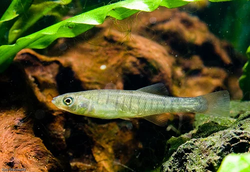 体色为橄士榄色至蓝灰色,体目局侧有许多细小横纹分布在上面。鱼鳍同上没有什么颜色,或者是来自呈浅绿色。它们属于群居的鱼种,性情十分温和,水族箱尺寸较大为好。
