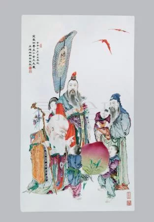 设色人物,绘福禄寿三星图和二侍童,赋色浓厚。