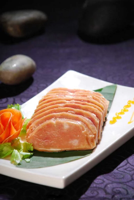 11、食用时,将蒸肉切成薄片,蘸醋、香油等调料,也可再配上其它凉菜。