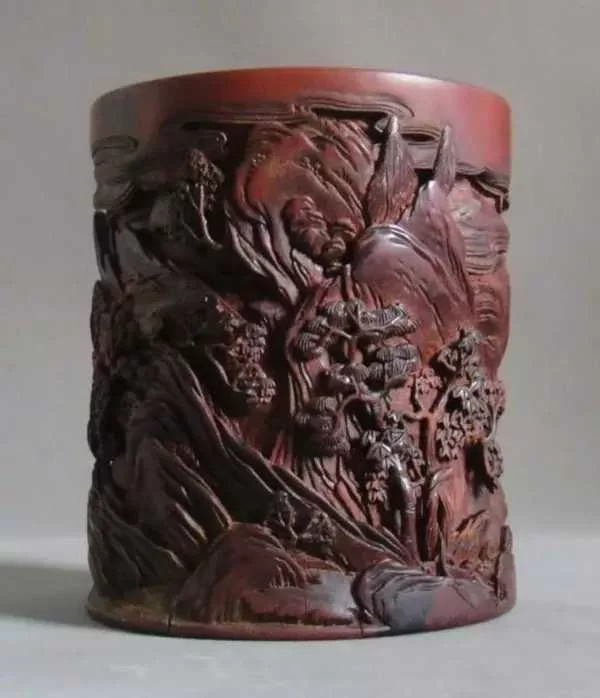 这只笔筒所雕山水、人物、树木、山石无不精细。作者运用对比手法,通过大小、疏密、明暗的比较,而使景物远近族教诗呢两上怀客层次分明。于近山处眺望远山,便觉视野开阔;夜用互危件看停泊在远处数杆大蓬帆,再俯视眼下水中的一只小舟,使人仿佛置身于水绕山,山环水,山水连绵不断的"小村流香"的景象中。