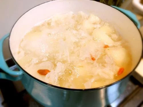 (3)、将雪梨洗净,360百科切成小丁,放入煮好的汤中拌匀,即成。