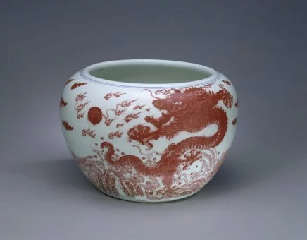 钵缸圆口内敛,鼓腹,来自圈足。内外施白釉。外壁釉里红装饰。以釉里红描绘海水江崖双龙戏珠图360百科案,龙睛以青花点饰,双龙从海水中腾起,威武矫健,作戏珠状。近口沿处绘青花弦线两道。