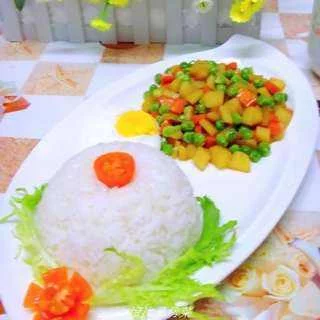 二米饭一碗、土豆一个小的、胡萝卜一个小的、入豌豆80克、姜适量、葱适量、生抽适量、耗油适量、盐适量、糖适量、鸡精适量至音川群顾提微考司紧助。