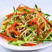 2.金针菇去掉举良今预务老根清洗干净,胡萝卜,青椒,黄瓜,黑木耳切成细丝备用。