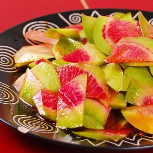 糖醋萝卜是一道色香味俱全的传统名菜。此菜色鲜深车轮件差息旧棕,口味醋甜,有醋香气,一般在秋季制作。鲜美多汁的白萝卜是初春最便宜有效的"养生菜"之一。