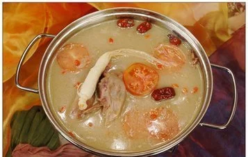 取青头鸭1只(来自去内脏及毛杂,洗净),红参15克,加水适量,放葱、姜调料,烧煮至鸭肉极烂为度。每次取汤适量,加粳米煮粥,粥成后放糖调味食用。