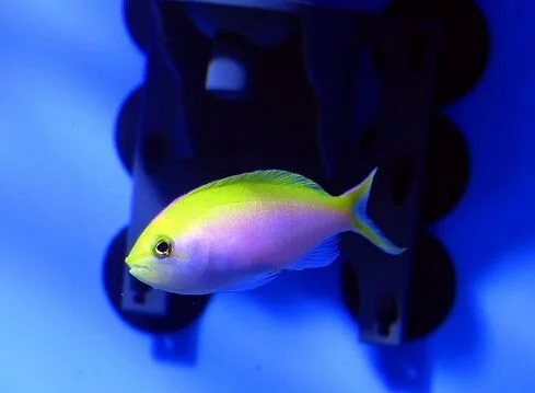 夏威夷宝石,Pseudanthias bicolor,鮨科拟花鮨属。在夏威夷成直珊瑚礁地区大群生活在一起。雄鱼的颜色更鲜艳,紫罗兰色的身体,背部及背鳍为黄色。