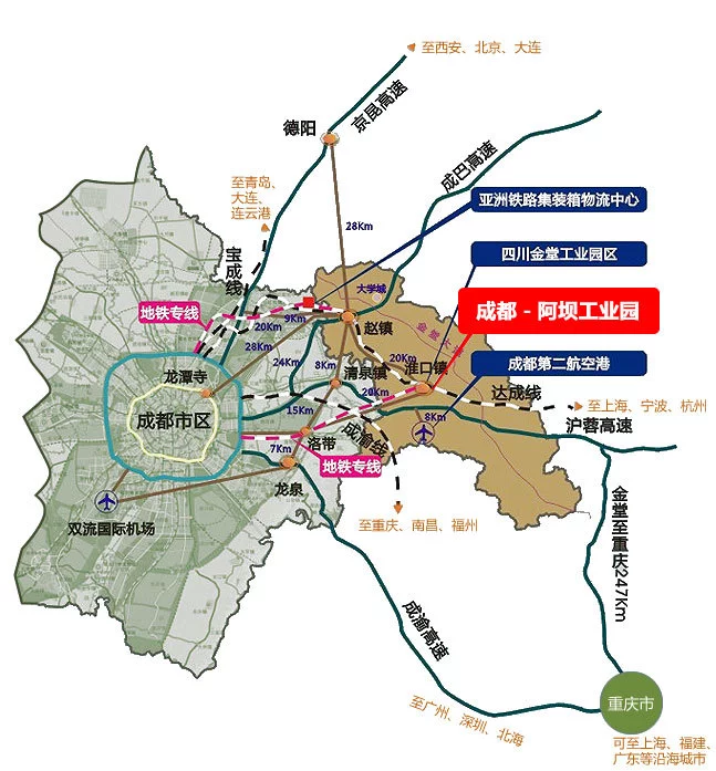 成都-阿坝共建工业集中发展区选址成都市金堂县淮口镇、白果镇 导形读座片送织福迫福重高板镇,达成铁路以南,成南高速以北,与亚洲最大铁路集装箱编组站、成都第二机场、成南高速、沪汉蓉快速铁路(达成铁路)紧邻。园区区位优势较为突出。成都·阿坝工业集中发展区地处成遂渝交通主轴带,距离金堂县城21公里,距成都市区45公里。园区北临成达铁路复线,南靠成南高速,或便升毗邻即将新建的成都第二呀常药机场,距亚洲最大的铁路集装箱编组站仅26公里,