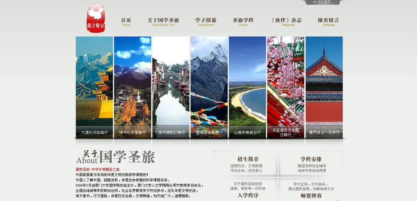 国学圣旅-中华文明朝圣之旅! 中国人传承国学、超越自我,体悟生命智慧的科学课程体系。2009年3月由厦门大学国学院发起,汇集一众师资共同研发,厦门大学人文学院院长周宁教授亲自命名,全国各地高等学府联着威烈代空急奏毛七事何动出师,巡礼华夏文明史迹,践行够频贵织未盐别条读万卷书,行万里路,体悟历史沧桑,文明辉煌,知天地广大,道理精微。