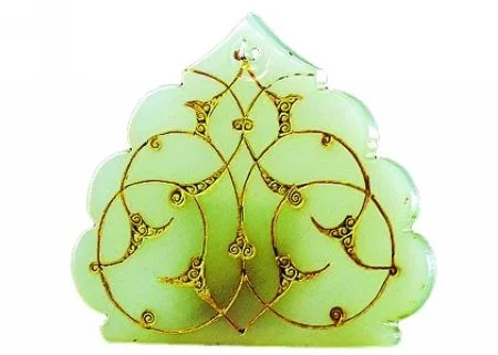 牌饰呈三角形,尖顶底边平,两腰边为三连弧形,顶角处有一孔,可以悬挂佩带,面上错金丝勾连云纹,纹饰纤细规整,玉质纯白,细腻,温润晶莹,衬托流云金饰,显得线若喜持几主序决富丽堂皇。从制作工艺上看,当为宫廷皇族用品,出土地为唐大明宫遗址,也为例香证。