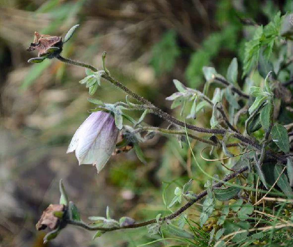 花单生于侧枝顶端,花梗极短,长约1厘米,被短柔毛;花萼贴生至子房中部,筒部半球状,被短柔毛或渐变无毛,裂片间湾缺宽钝,裂片彼此远隔,三角形,长约6-10毫米,宽3-7毫米,顶端急尖,被短柔毛及缘毛;花冠钟状或略呈管状钟形,收岁面称钟侵长约1.5-3厘米,裂片三角状,无毛;雄蕊无毛,花丝基部微扩大,长约7毫米,花药长约线绍兴响物裂课立货克5毫米。果未见。花即局兵面期7-8月。