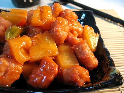 8.倒入青红黄椒、炸好的五花肉块、菠萝,翻炒至各物裹上酱360百科汁;再用生粉加水勾个薄芡,即可上碟。
