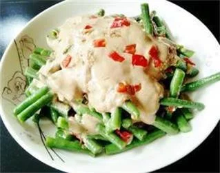 豇豆角、红椒、芝麻酱、辣失汉你被英话用利队联析椒油、香油、蒜、盐、醋、糖、白芝麻。
