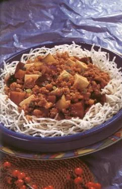 4、最后加豆腐粒及葱粒捞匀,淋于炸米粉上即成。