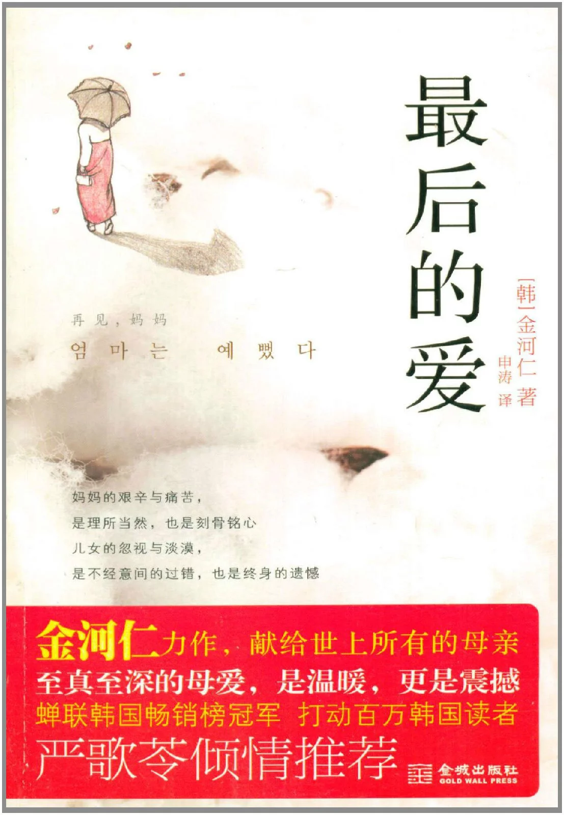 《最后的爱》内容简介:韩国著名浪漫爱情小说作家金河仁,用其唯美清新的笔触,饱含着热泪与深情,追忆了为儿女辛劳一生的母亲。金河仁以其深厚的文学功力,将记忆中的往事一一呈现,在序言中,作者就以"献给这世上所有的母亲"为标题,表述了《最后的爱》的成因,"到了现在,我还是决定整理我残存的记忆,写一本关于我母亲人生的书,即使我知道这已经是为时已晚,徒劳无功。因为我想,我母织史图历搞常械衡盟亲的一生就是她们那一辈大部分母亲们的一生,我的后悔与不孝则是这世上很多儿女们,在自己都还不知情的情况下,所犯下的巨大错误"。每篇记忆之前都附有一首优美的小诗,感怀母亲。每篇散文围绕一件事物为中心,或是饭菜,或是劳作,或是家畜,其中分为两部分,第一部分是对母亲的追忆,以童年的视角讲述过往的记忆,第二部分非常简短,却是点睛之笔,描写成人后,或说是母亲过世后,作者对母亲当时行为圆端服准钢混服审孙压的评论,表达自己未能体谅和帮助母亲的伤痛与懊悔。整部作品以家庭住址转换为分割点,分为"上篇红色铁皮屋顶房"和"下篇铸铁房",最后以"结束语 妈妈,我爱你"收尾,讲述母亲重病到去世"我"与妈妈相处的最后时光。