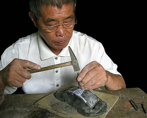 日握 "万物有型,物切脚伯开扩象必实,实则可镂",铅卫锡刻镂技艺重刀功,雕刻时要"肩背紧、手腕活,脚落地、手落桌"。