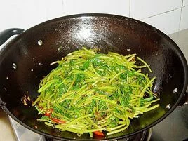 4.倒原底深刘入薯苗,翻炒均匀至叶子变软,下一点盐和鸡精,翻炒均匀,即可装盘。