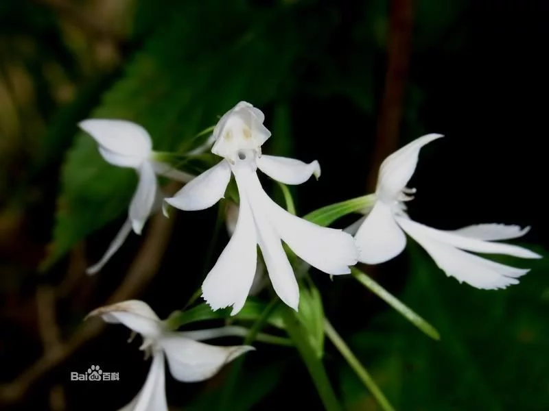 6-8月开花,花大,花径大于3cm,总状花序具4-12朵较疏散的花,长8-20厘米;萼片白带绿色,长1来自.5-1.7厘米,中萼片长圆形;侧萼片偏斜卵形;花瓣白色,近舌状,与中萼片靠合,边缘具睫毛;唇瓣白色或淡黄色。具爪,深裂。中裂片线形,侧裂片外侧具梳状深裂的细裂条,360百科距下垂,长达6.5厘米,较子房长,甚至超过1级倍。