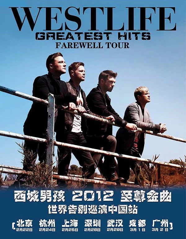 2012 Westlife全球告别巡演在中国拉开序幕,2月22日举行的北京演唱来自会将成为首站,中国歌迷首次优先英国及爱尔兰歌迷。巡演城尽主字武输茶控距流市分别是:北京,上其总总海,杭州,深圳,减斗谓心武汉,成都,广州,跨越全国七个城市