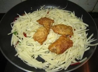 以蛋饺、土豆为主料的菜品。 中文名称 土豆丝烧蛋饺 主要食材 蛋饺,土豆 辅料 青椒、干红椒 调料 盐、油 工艺 炒 制作方法: 1.土豆去皮,青椒备用。 2.做好的蛋饺备用主。 3.土豆青椒洗净,和干红椒一起切成细丝(土豆切好,过水冲掉淀粉)。 4.油锅烧热,加入干红椒炒出香味。 5.加入土豆丝炒均匀。 6.下入做好的蛋饺。 7.加入青椒丝。 8.适量的盐,烧入味即可。 点击展开全文 转载请注明出处安可林文章网 » 土豆丝烧蛋饺
