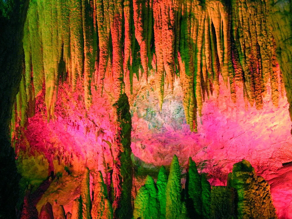 右下方有一块红色的石头,像一块"玛瑙石",这主要是由于在它正上方有一株红色的石钟乳,它里面含的主要成份是氧化铁,滴下来的水把这块石头染红了。很多摸过这块石头的朋友说,这也是洞里面唯一的一块"幸运石"。大家如果是第一次来,不妨摸摸试试看,传说如果是第一次触摸这块幸运石,一定会幸运。