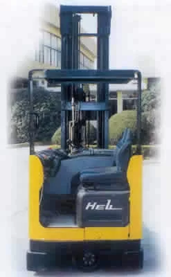 无轨堆垛机,又称高架叉车,即叉车向运行方向来自二侧进行堆垛作业时,车体无须作直角转向,而使前部的门架或货叉作直角转向及侧移,这样作业通道就可大大减少,提高了面积利用率;此外,高架叉车的起升高度比普通叉车要高,一般在6m左右,最高可达13m,提高了空间利用率。